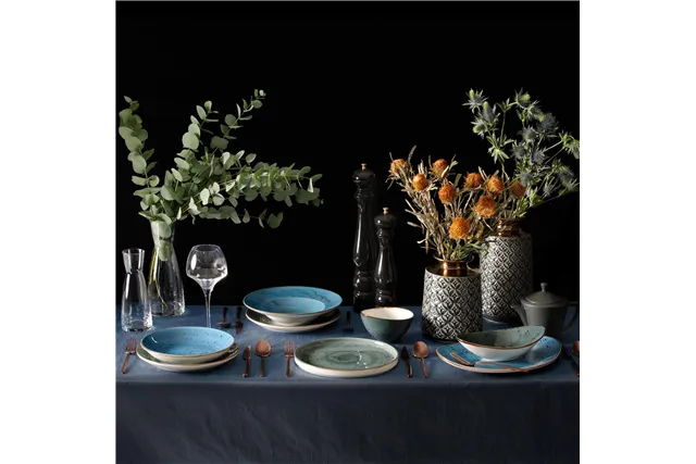 Bogata kolekcja ręcznie zdobionej porcelany w czterech soczystych kolorach. Dopasuj elementy pomarańczowe, niebieskie, szare i oliwkowe, aby uzyskać unikalny i zaskakujący wygląd stołu, a jedzenie będzie prezentować się tak samo dobrze, jak smakuje. Zastawa wytrzymała i odporna, zaprojektowana tak, aby wytrzymać trudy użycia w profesjonalnej kuchni.