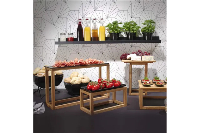 System bufetowy Madeira Black jest wykonany z najwyższej jakości drewna, które jest piękne, trwałe i odporne. Skrzynki mogą być używane jako pojemniki na pieczywo lub owoce, ale nadają się szczególnie do ekspozycji przy użyciu systemowych pły Madeira lub tac melaminowych. Dzięki nim z łatwością stworzysz wielowymiarową kompozycję.