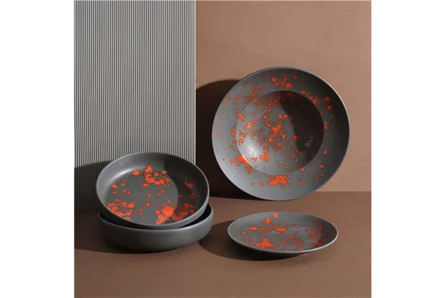 Nasza kolekcja jest wykonana z czarnej porcelany, a matowemu wykończeniu odrobiny swobodnej elegancji nadają kontrastowe plamki. Każdy element jest wyjątkowy i wygląda niemal zbyt dobrze, aby mógł być prawdziwy, ale nadal można go myć w zmywarce i używać w kuchence mikrofalowej