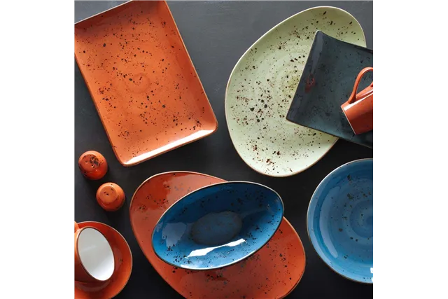 Bogata kolekcja ręcznie zdobionej porcelany w czterech soczystych kolorach. Dopasuj elementy pomarańczowe, niebieskie, szare i oliwkowe, aby uzyskać unikalny i zaskakujący wygląd stołu, a jedzenie będzie prezentować się tak samo dobrze, jak smakuje. Zastawa wytrzymała i odporna, zaprojektowana tak, aby wytrzymać trudy użycia w profesjonalnej kuchni.